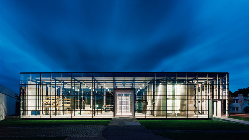 Der klare Glaskubus umfasst Werkbereich, Foyer und das 2-geschossige Büro, das wie ein Möbel frei in der Glashülle steht. Die großzügige Raumstruktur erlaubt vielfältige Wechselbeziehungen: Ausblicke und Einblicke zwischen Innenleben und Außenwelt, zwischen Werkhalle und Büro, Empfang und Pausenbereichen. Die transparente Architektur spiegelt die Unternehmenswerte der Wall AG wider. Stahl, Glas und Aluminium bilden das Gebäude in Anlehnung an die für Stadtmöbel verwendeten Materialien. Die klaren Töne Weiß, Schwarz und Silber dominieren, Eichenparkett erzeugt Wärme im Bürotrakt. Im Foyer zitiert der Kieselsteinbelag die traditionellen Pflasterintarsien der Freiburger Innenstadt.